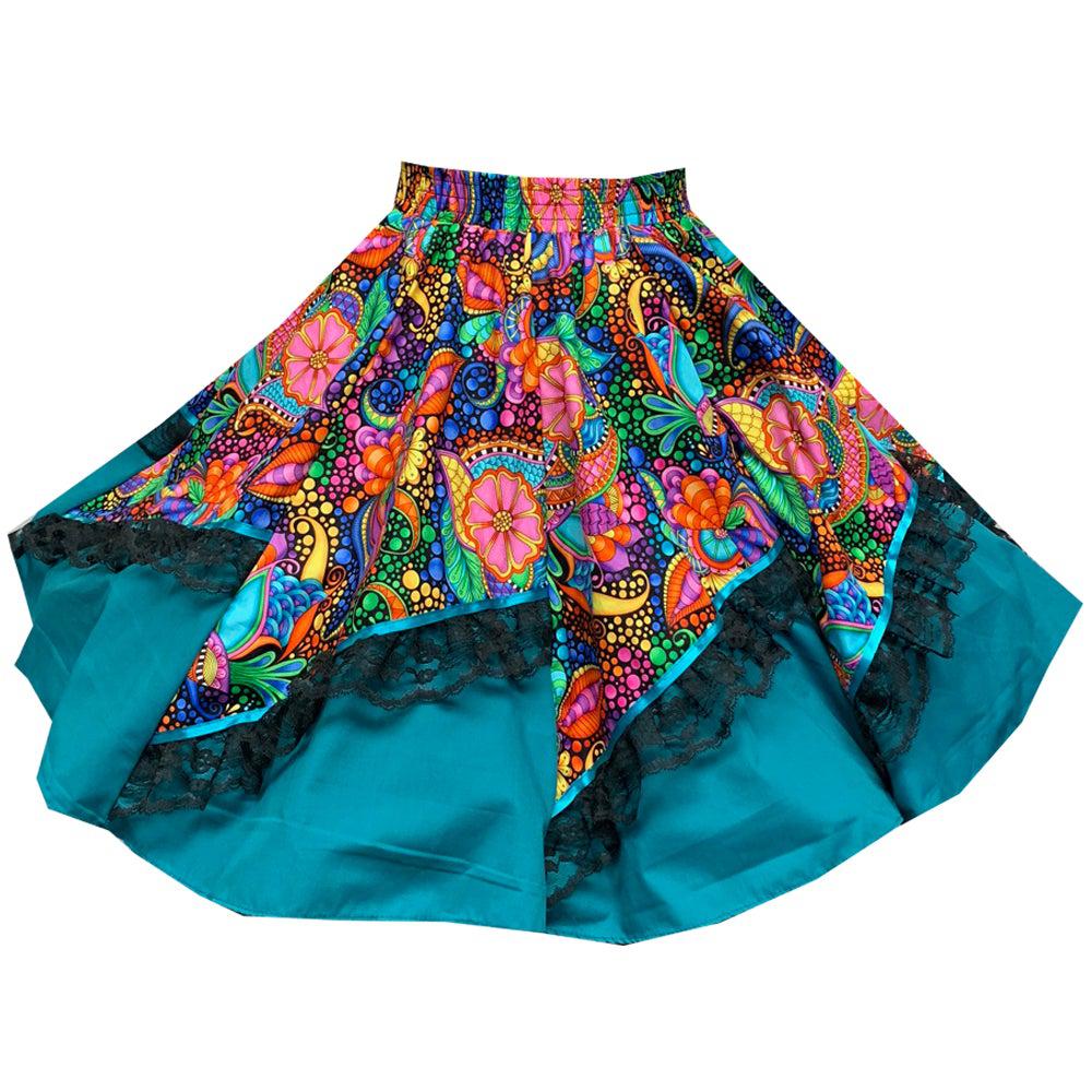 This is an exciting colorful print with all of the colors in the rainbow. The fiesta array of colors let us choose the brightest ones to enhance the design. The diagonally cut gore, with black lace gathered in, is finished off with the satin matching ribbon to show off the pinwheel design.