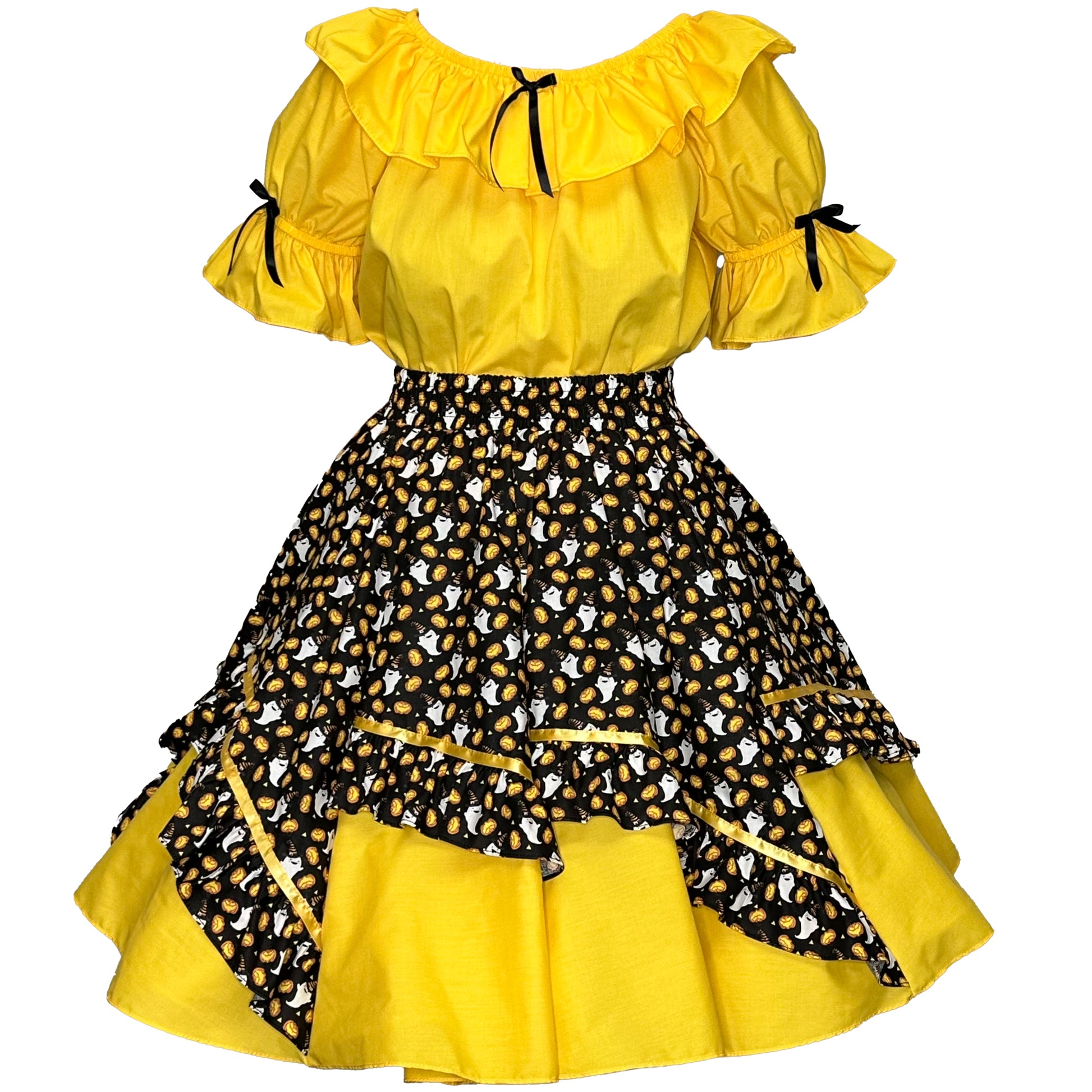 This festive two-piece Halloween set is both playful and eye-catching! This “spirited” print has Jack-O lanterns and ghosts wearing a witch’s hat all over. The bright pencil yellow peasant-style top features ruffled sleeves with black bow accents and an elastic at the neckline with a matching ribbon. The full circle skirt in a diagonal pinwheel design, brings the look to life with a fun Halloween print of cheerful white ghosts wearing witch hats alongside bright orange pumpkins, all set against a black background. Coordinating yellow panels and layered ruffles add extra flair and volume, making it perfect for twirling at parties, parades, or fall festivals. Cute, comfortable, and full of seasonal charm—this outfit is ready to light up Halloween night!