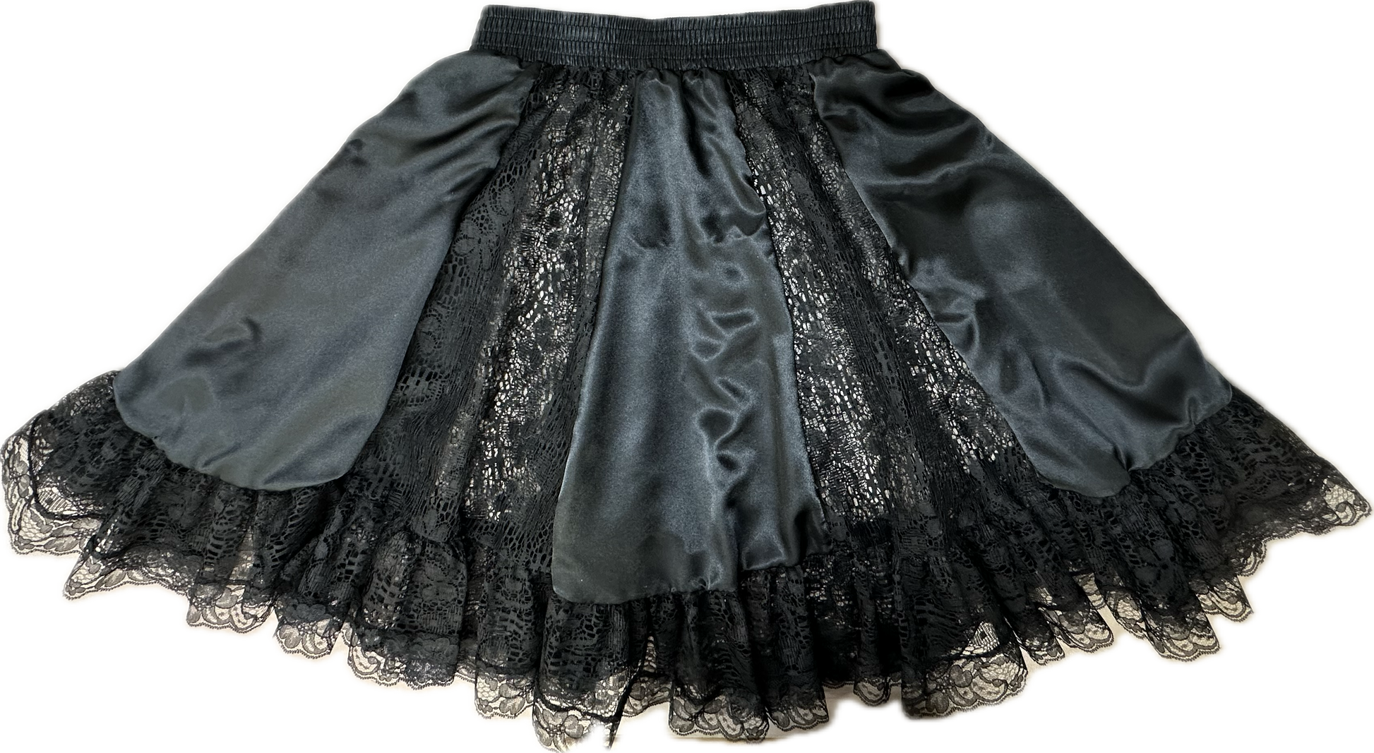 This 12-gore skirt has alternating gores of see-through overall lace and shiny charmeuse fabric (100% polyester). This way, whatever color petticoat you wear will be seen thru the gore and bottom ruffles. A see-through overall lace ruffle at the bottom is met with a 2 " lace for an elegant finish.