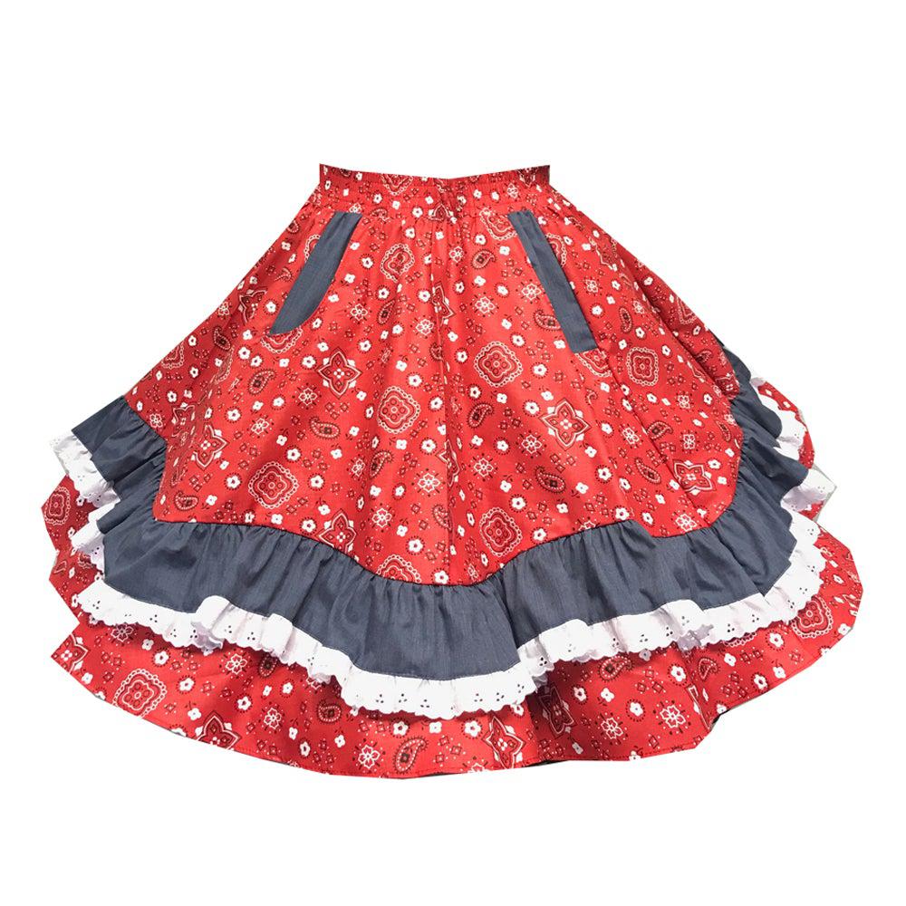 Are you looking for something western to wear? We have it for you with this red bandana print outfit. The gored skirt has pockets for everything you need to keep close, and is gussied up with this chambray color and gathered white eyelet lace. Waves riding up and down the gores, curve and flow around this do-si-do country skirt.